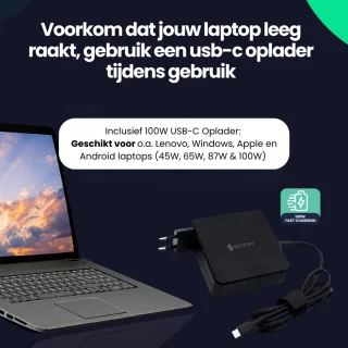 - Krachtig opladen — De meegeleverde USB‑C adapter levert tot 100W Power Delivery, zodat je laptop en andere apparaten snel en efficiënt opgeladen worden.