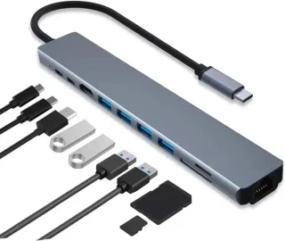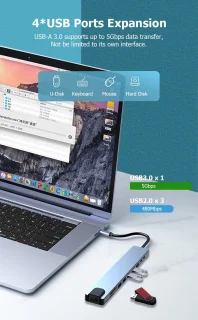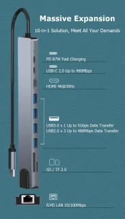 - 10‑in‑1 aansluiting: 1 Gigabit Ethernet, 1 HDMI‑poort (4K‑compatibel), 4 USB‑A‑poorten, 1 USB‑C data‑poort, 1 USB‑C PD‑poort (100W), 1 SD kaartslot en 1 micro‑SD (TF) kaartslot.